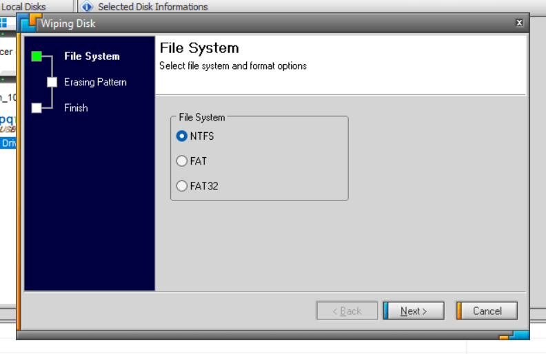 - Select a file system—NTFS, FAT, or FAT32. Then, select Next.
