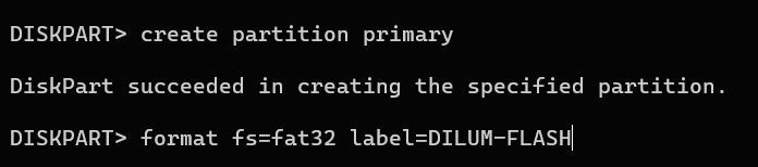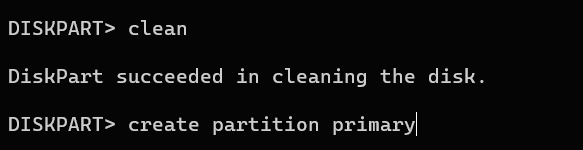 - Type create partition primary and press Enter to partition the drive.