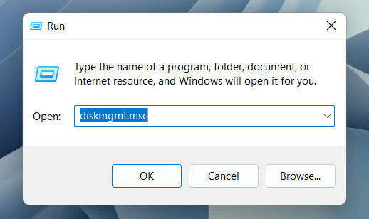 - Press Windows Key + R to open the Run box. Then, type diskmgmt.msc, and press Enter.