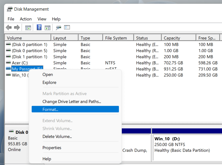 The Disk Management console is a versatile utility that allows you to manage drives, volumes, and partitions in Windows. It also allows you to format drives quickly. Use it if an external drive fails to appear in File Explorer.