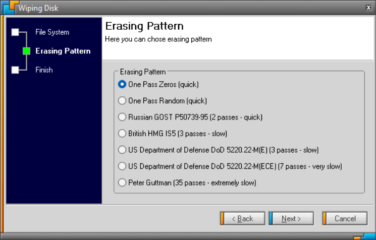 - Select an erasing pattern. For example, you can overwrite the storage device’s contents with a single pass of zeros or use sophisticated data wiping techniques such as the Peter Guttman method. Note that using methods with multiple passes can take a long time to complete.