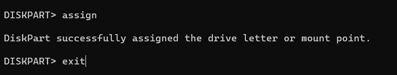 - Type assign and press Enter to assign a drive letter for the drive.