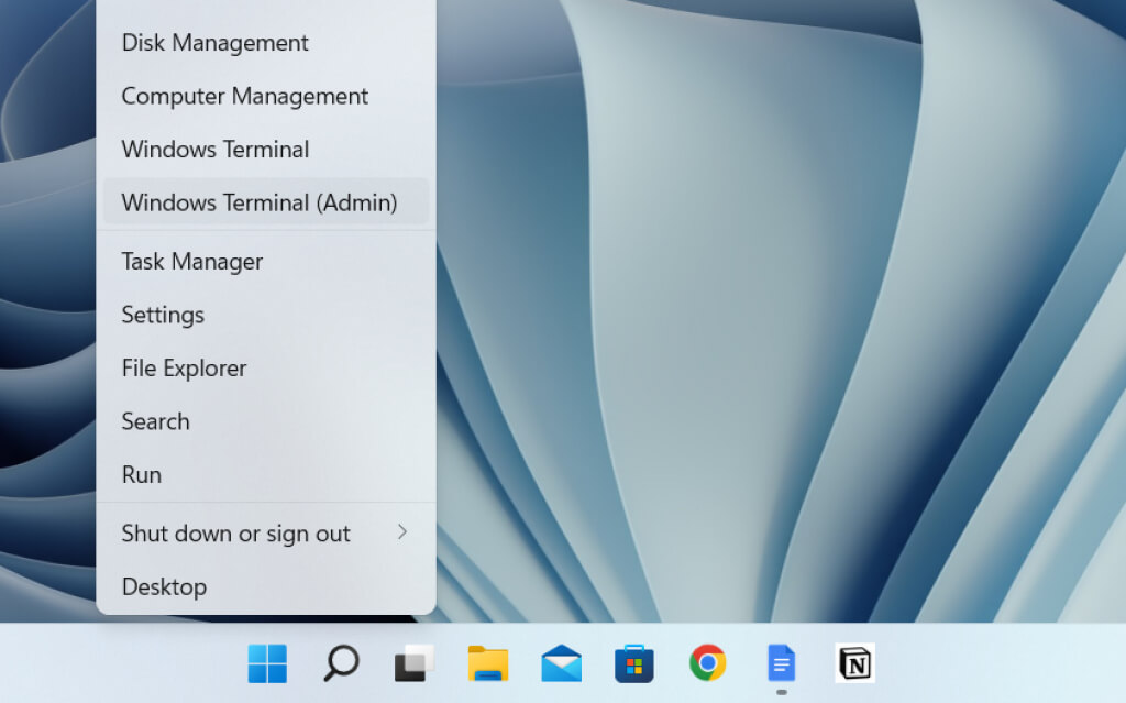 - Open the Start menu, type cmd, and select Open as administrator to open the Command Prompt console. If you prefer Windows PowerShell, right-click the Start button and select Windows PowerShell (Admin) or Windows Terminal (Admin).