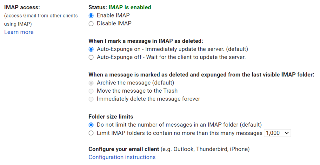 For IMAP, ensure that Enable IMAP is selected and that the number of messages per folder is not limited.