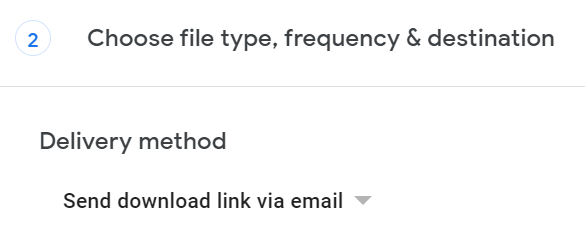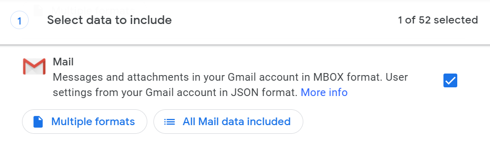 - Google Takeout will default to All Mail. If you choose to export only emails in conversations with select labels, select the **All Mail data included** button. From there, you can choose Gmail labels for your export. * Scroll down to the bottom of the page and select the **Next step** button. * Next, choose the delivery method for the export. You can choose to **Send download link via email**, **Add to Drive**, **Add to Dropbox**, **Add to OneDrive**, or **Add to Box**. If you opt to have a download link emailed to you, Google gives you a week to download the files.
