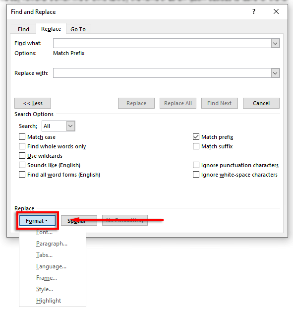 You can also replace formatting on a word or phrase in your document. To do so, select Format. The dropdown menu offers several options to replace font, formatting, style, and other characteristics. For example, if you want to highlight all instances of a word, you could select Highlight.