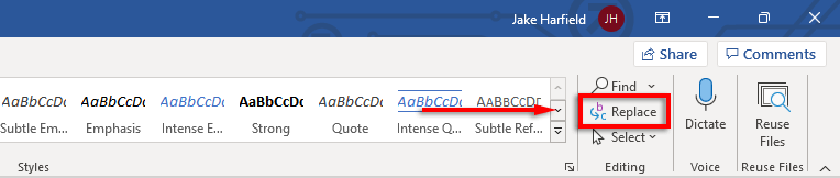- Select the downward arrow next to Find and click Replace.