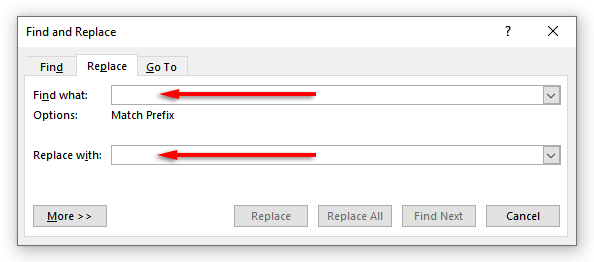 - In the “Find what” field of the dialog box, enter the word or phrase you want to replace. Next to “Replace with,” enter the word you want it to be replaced by.