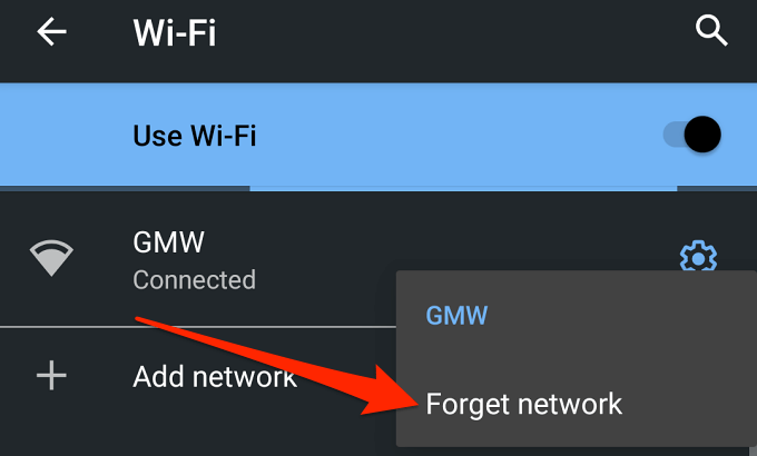 On your Android device, go to the Wi-Fi settings menu, long-press the network, and select Forget network.