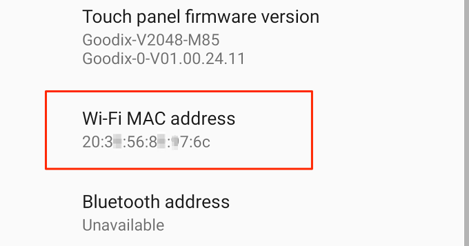 Compared to iOS, Android offers more options to check MAC addresses. You’ll find your device’s permanent (static) MAC address in Settings > About phone > Wi-Fi MAC Address.