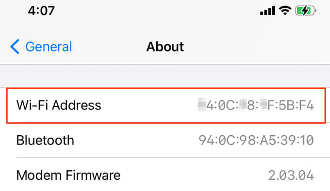 To check the static MAC address assigned to your iPhone by Apple, go to Settings > General > About and check the Wi-Fi Address row.