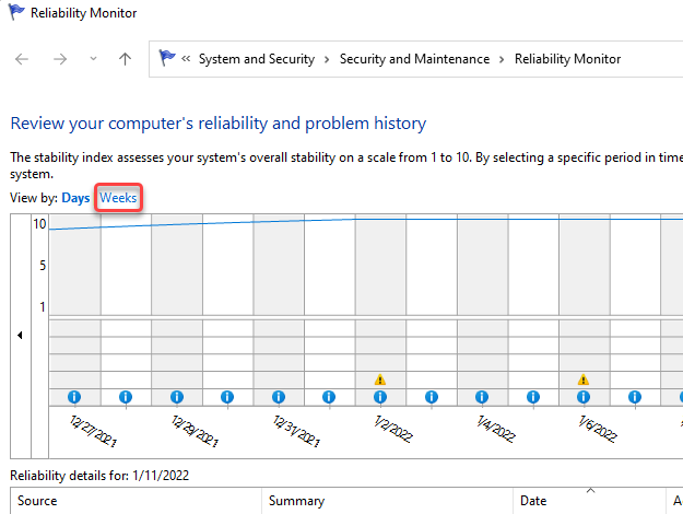 Once the Reliability Monitor is open, you’ll be able to see day-wise columns with the current date at the extreme right and the events on each of those days. You also have the option to choose a weekly view by selecting Weeks from the top-left.