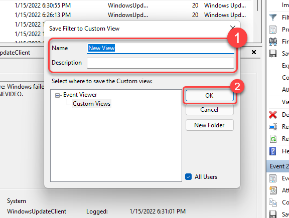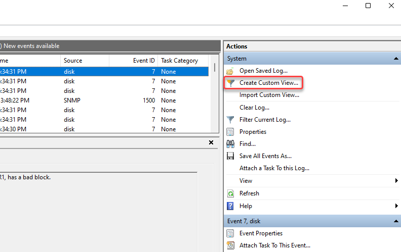 Alternatively, you can create a custom view to filter and find critical events. You can do this by selecting Create Custom View from the right sidebar on the Event Viewer. You’ll see a new window pop up.
