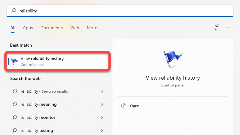 You can open the Reliability Monitor by searching for it in the Start Menu. Type reliability in the Start Menu search bar and select View reliability history on Windows 10 or 11.