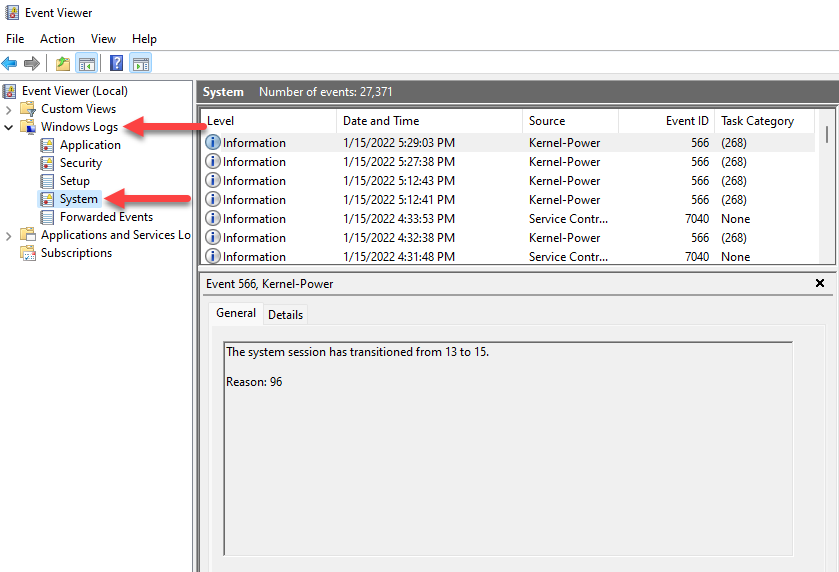 Upon launching the Event Viewer, you’ll see a list in the left sidebar. You’ll find crash logs for a BSOD event or your PC crashing for any other reasons in the Windows Logs > **System **section.