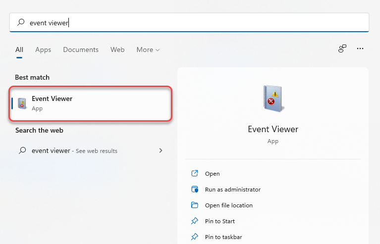 To access Event Viewer on both Windows 10 and 11, type event viewer in the Start Menu search box and press **Enter **to select the Best Match.