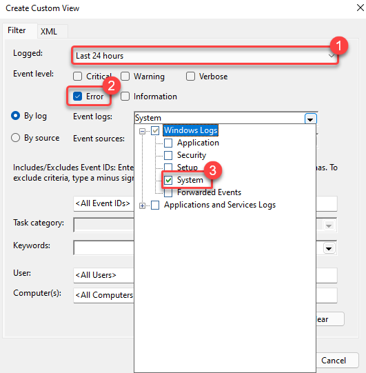 Select the relevant duration based on when the crash event occurred from the drop-down next to the Logged option. Check the **Error **box in the Event level options and select System from the drop-down menu next to the By log option.