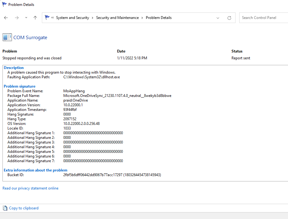 You’ll also see critical events listed at the bottom—double-click on an event to get more information about what caused it. For instance, in the following case, the event log says that Windows stopped responding because of OneDrive.
