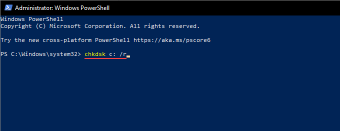Running the CHKDSK utility at startup can help fix additional drive-related errors. Start by running the following command in an elevated Windows PowerShell console: