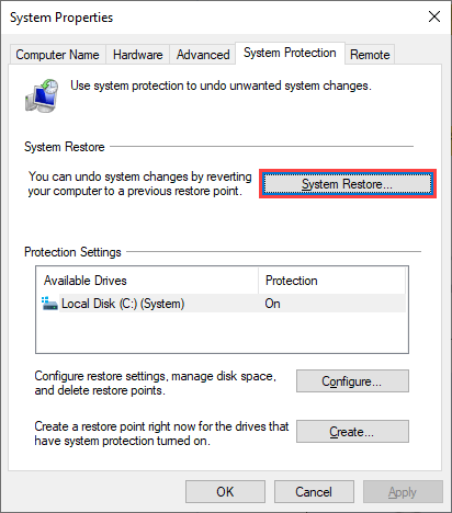 - Switch to the** System Protection** tab and pick the option labeled System Restore.