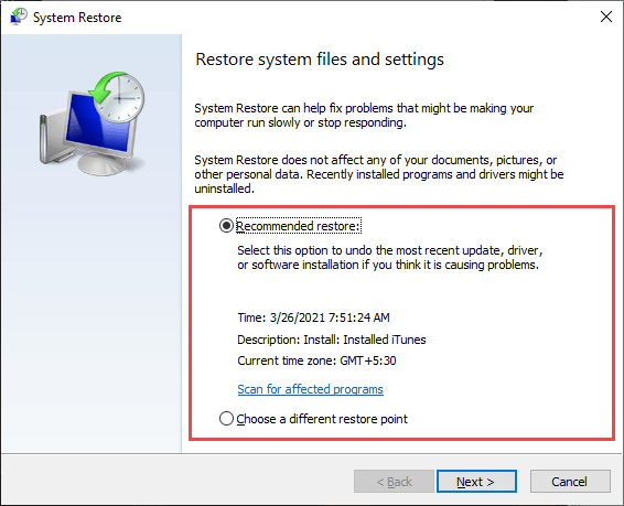 - Select **Recommended restore **if you want to use the most recent restore point, or Choose a different restore point if you want to pick a different restore point.