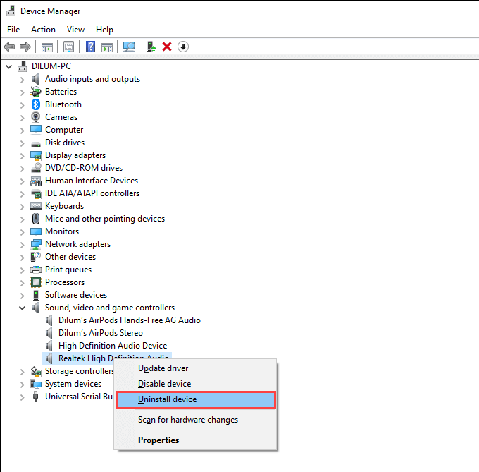 Right-click the device driver and select Uninstall device.