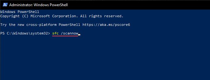 Running an SFC (System File Checker) scan helps fix file corruption within the operating system. To do that, right-click the **Start **button and select Windows PowerShell (Admin). Follow that by running the following command: