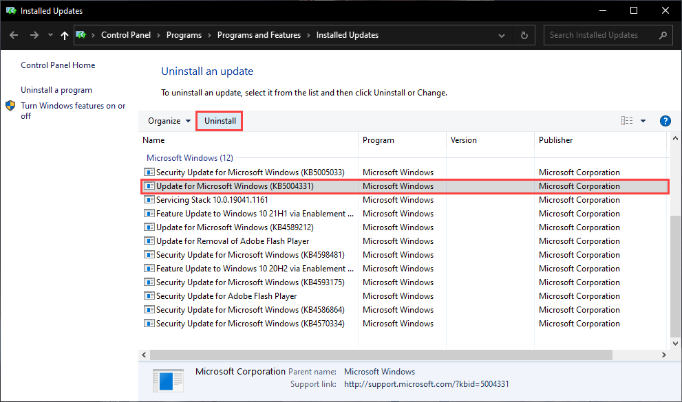 - Pick the update you want to remove and select Uninstall.
