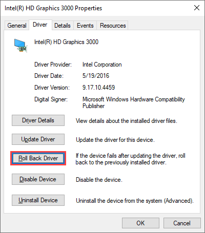 Switch to the **Driver **tab and select Roll Back Driver.