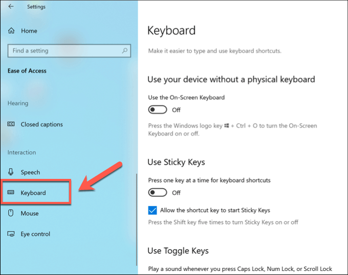- In the Keyboards menu, find the Use Filter Keys setting. Click the toggle for this setting to disable it, ensuring that the Off label is displayed.