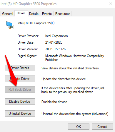 - Select the **Driver **tab and then select the **Roll Back Driver** option. If the option is grayed out, there’s no previous driver to roll back to.