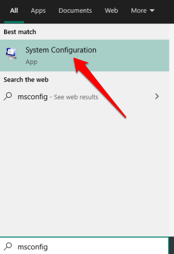 - To do this, type msconfig in the search box and select System Configuration.