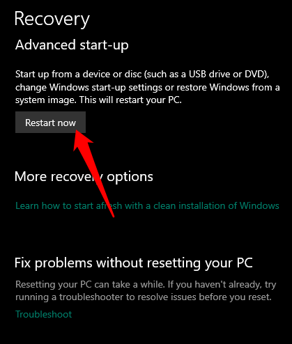 - Select **Restart Now** under the **Advanced Startup** section.