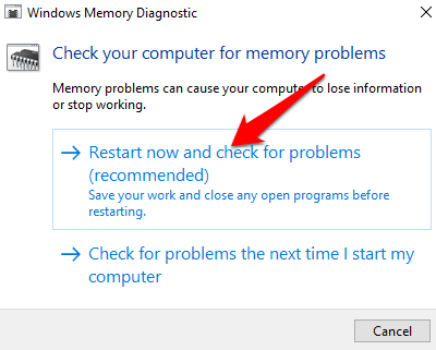 - Select **Restart now and check for problems (Recommended)** in the Windows Memory Diagnostics popup.
