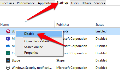 - Next, select each startup item in the Task Manager and select **Disable**.