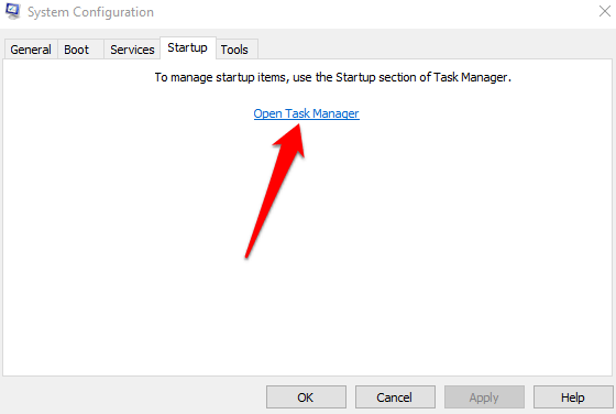 - Under the **Startup** tab, select **Open Task Manager**.