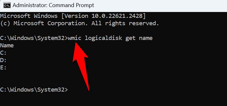 - Enter the following command on the open window and press Enter: wmic logicaldisk get name