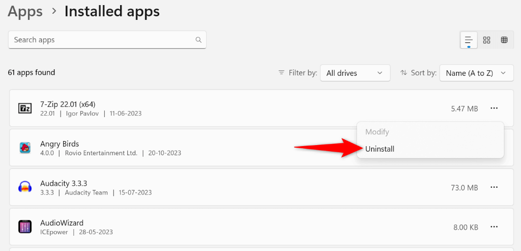 If your command runs fine when you’ve clean-booted your system, an installed app on your PC is causing the problem. In this case, remove that app from your Windows 11 system by heading to Settings > Apps > Installed apps, selecting the three dots next to the app, choosing Uninstall, and selecting Uninstall in the prompt.
