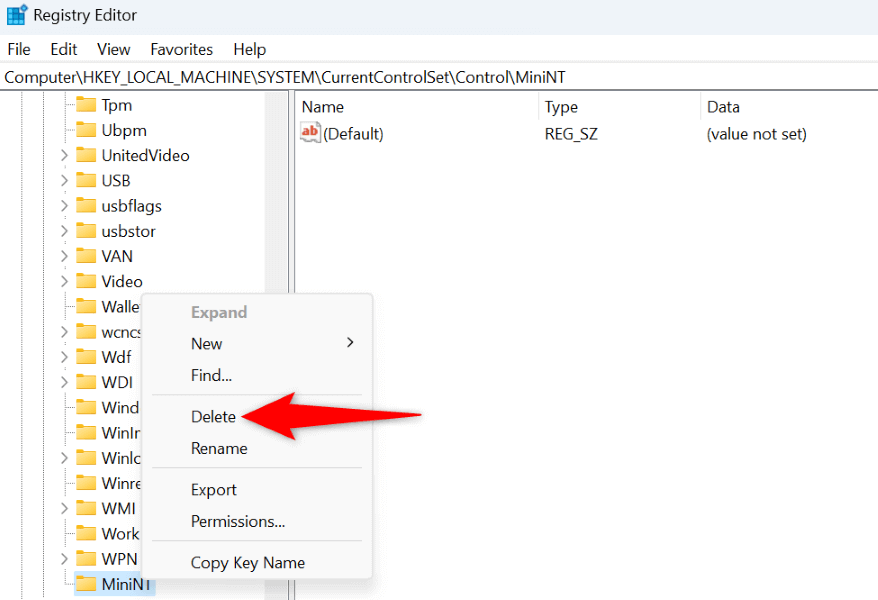 - Select Yes in the User Account Control prompt. * Head to the following path in Registry Editor: HKEY_LOCAL_MACHINE\SYSTEM\CurrentControlSet\Control * Right-click the MiniNT folder in the left sidebar and choose Delete.
