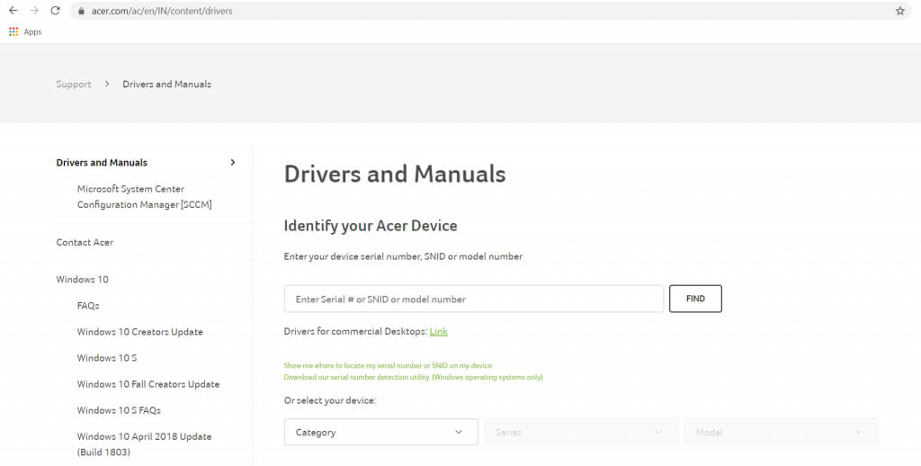 - First, head to the driver’s download page of your PC’s manufacturer. It can be Dell, HP, Lenovo, etc. We are going to demonstrate with an Acer laptop.