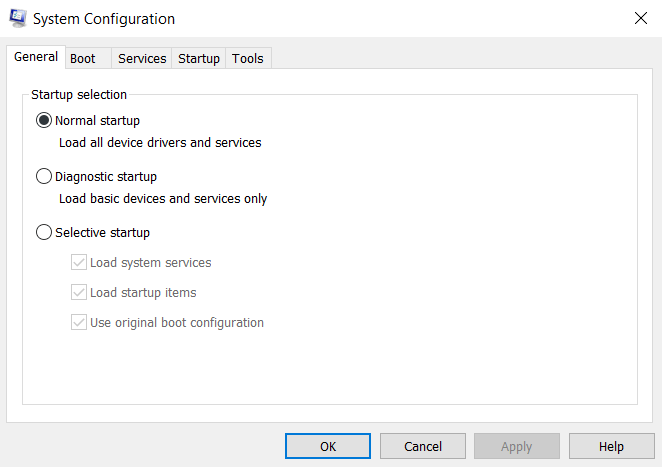 - The System Configuration app will open in a new window. By default, it will start at the General tab. Click on **Services **to switch to that tab.