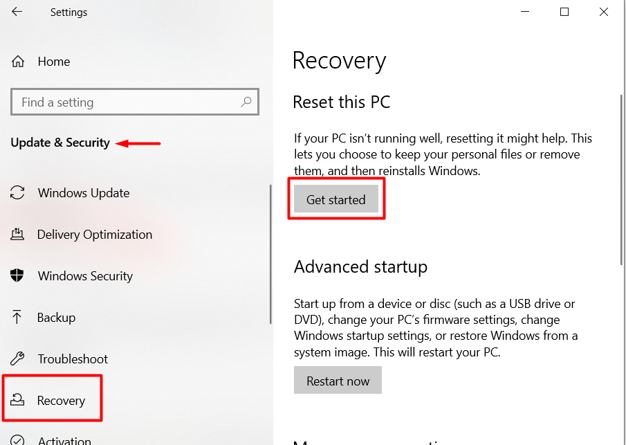 Select Update & Security and go to Recovery.