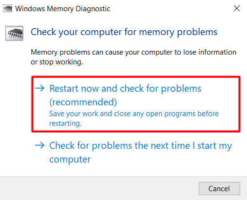 - Click on the first result to launch the tool, and select the **Restart now and check for problems **option.