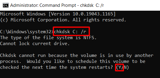- If you get an error as seen in the image above, simply type Y to schedule the chkdsk operation next time you reboot your computer.