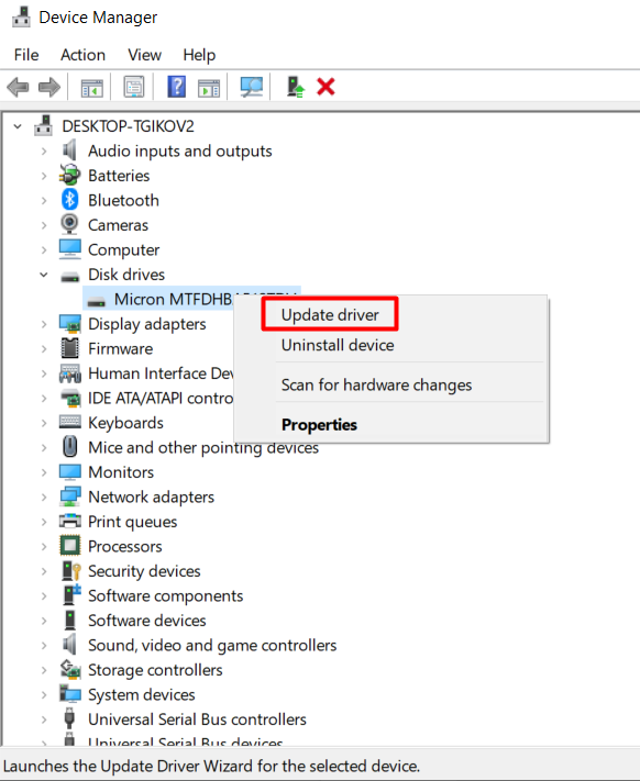 - Launch the tool and locate the Disk drives section. Under it, you’ll find your hard drives. Select each drive, right-click on it, and choose Update driver from the menu.