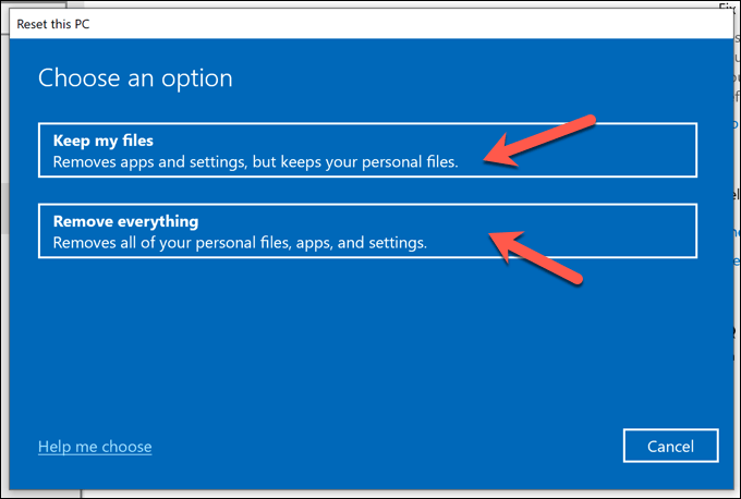 - In the **Reset this PC **menu, you’ll be given options to keep your files or wipe your drive completely, restoring Windows 10 to the factory default. Select either **Keep my files** or **Remove everything **to make your choice.