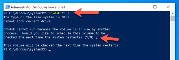 - With the SFC tool complete, type **chkdsk C:****/f **to check your system drive’s file system integrity. Windows will ask you to schedule this for your next reboot, allowing a boot level scan of your drive to complete. Type **Y** and select the **Enter** key to confirm this, then restart your PC.