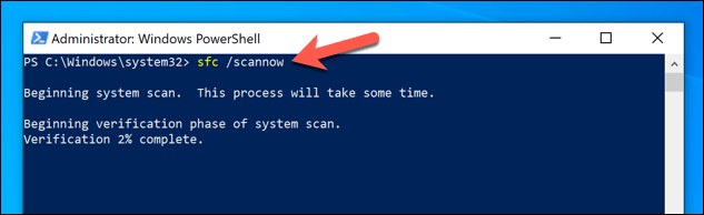 - In the **PowerShell **window, type **sfc /scannow** to run the System File Checker tool. You’ll need to wait for SFC to complete the scan of your system files and, where possible, repair them.