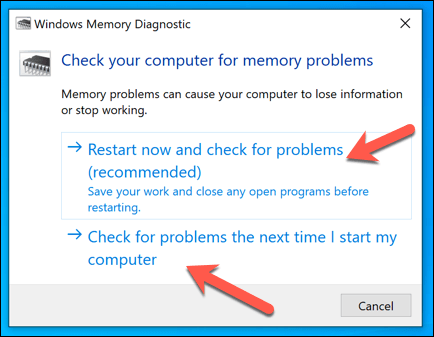 - In the **Windows Memory Diagnostic **window, Windows will ask you for permission to restart. Select **Restart now and check for problems** to do this immediately or choose **Check for problems the next time I start my computer** to delay this until your next restart.