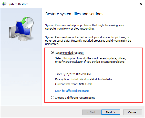- Select Recommended restore to undo the most recent changes to the operating system. Or, select Choose a different restore point to pick another restore point.